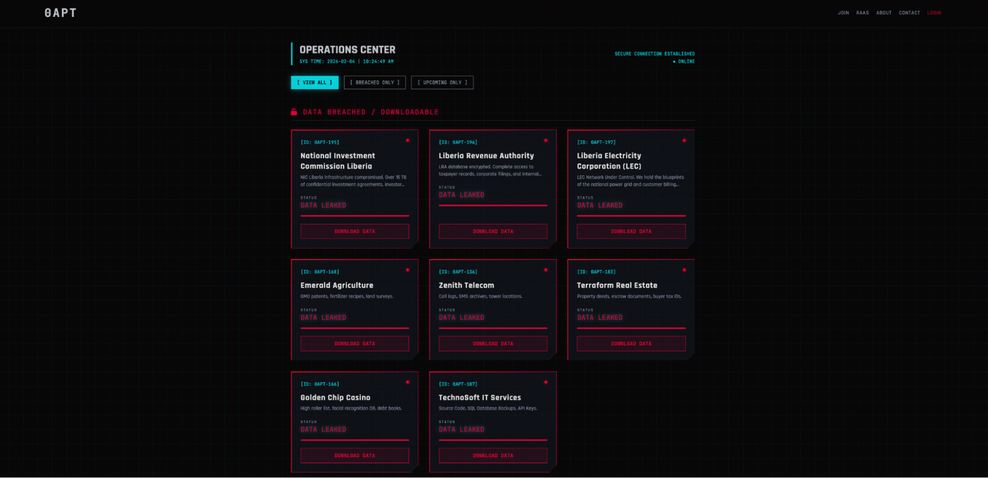 The threat actor 0APT appeared in January 2026 and within only a few days claimed more than 150 victims via its DLS on a Tor-based domain. However, it quickly became clear that many of the alleged victims could not be verified and appeared to be artificially generated.